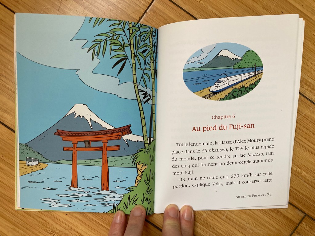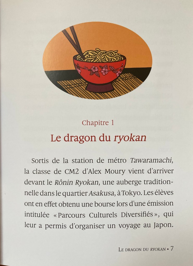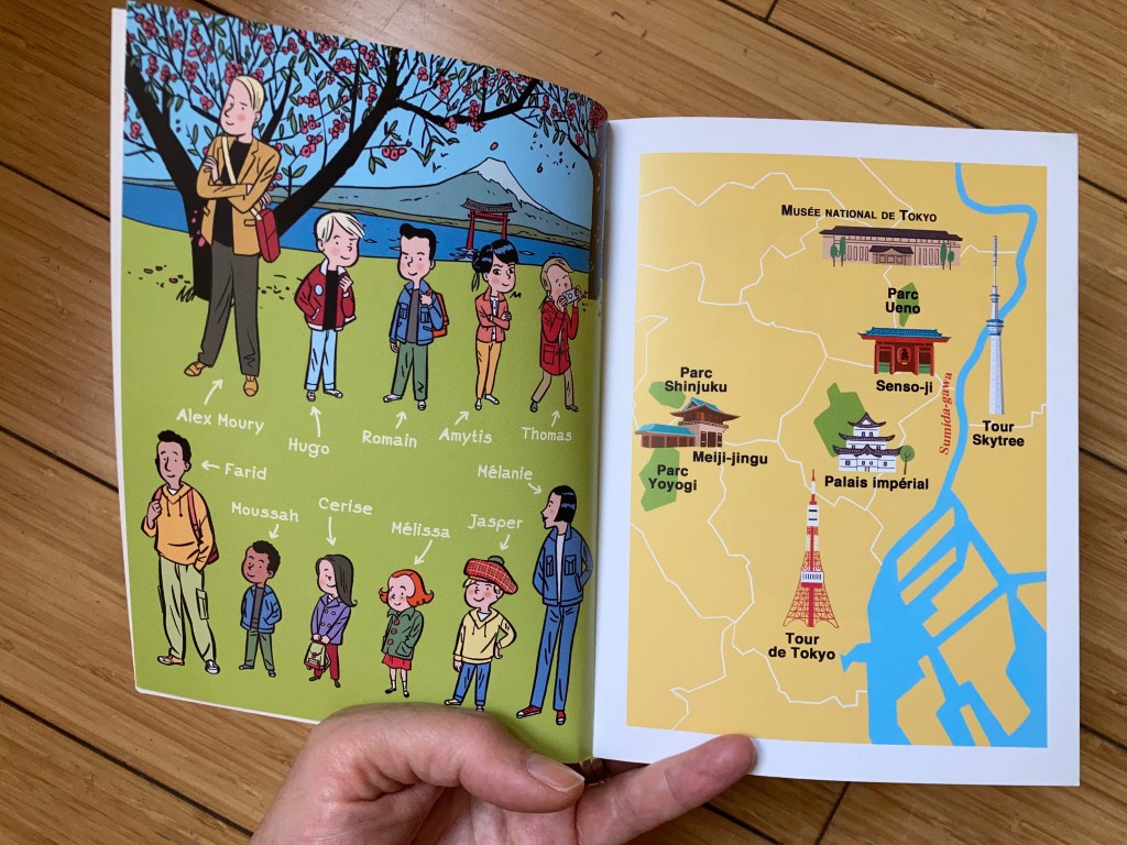 Le maitre est accompagné de Farid, qui a l’air de bien connaitre la culture japonaise et Mélanie. Il y a un bon condensé culturel du Japon dans ce livre, Yoko, l’ancienne correspondante de Farid, fait visiter la ville aux enfants, nous parle de son pays et de ses traditions. Il y a même plutôt beaucoup d’informations à digérer