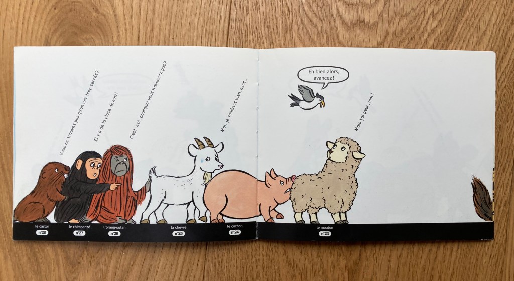 Parfois un herbivore est derrière un carnivore et ne veut pas avancer; plus on avance dans la queue, plus les animaux sont de grande taille. C’est dans les toutes dernières pages que nous découvrons enfin pourquoi tous ces animaux font la queue.