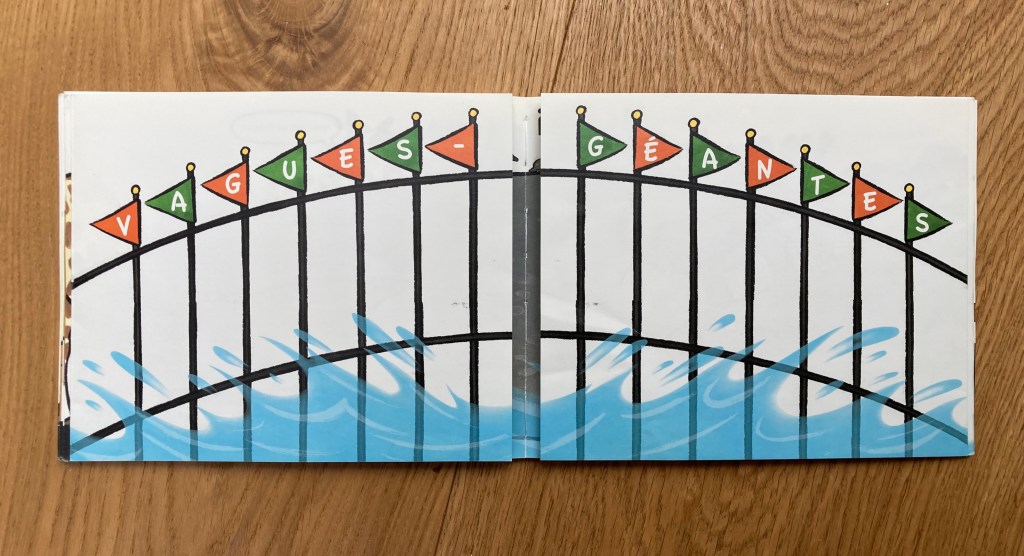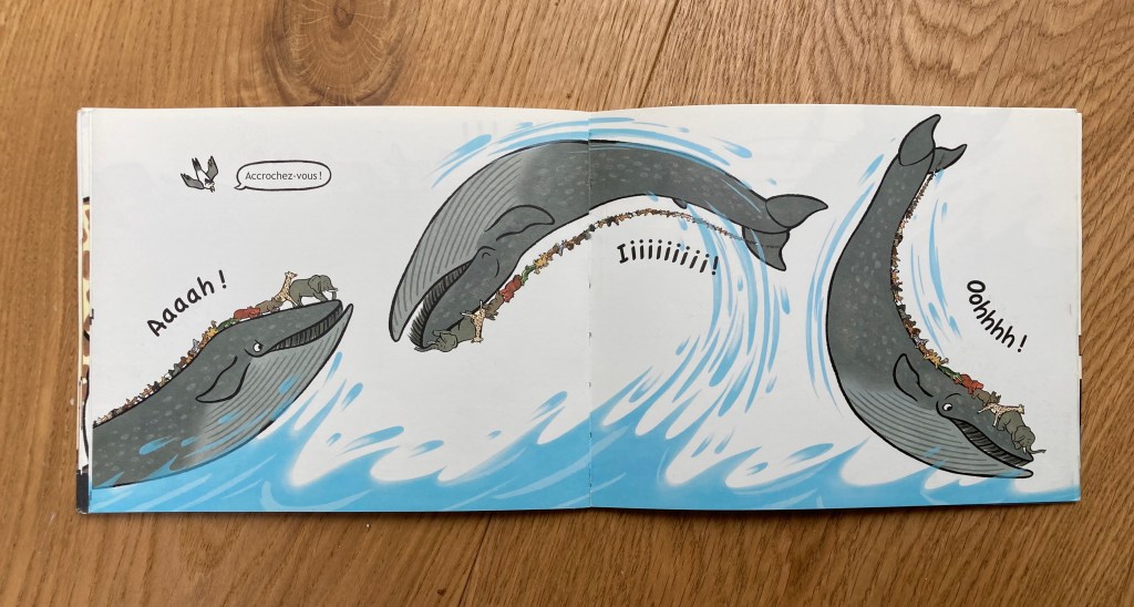 Je vais vous révéler la fin, car cet album n’est pas une nouveauté et il a sans doute déjà croisé votre chemin. Ils font la queue pour participer à une attraction de « vagues géantes », effectivement, ils vont tous monter sur le dos du plus grand mammifère au monde, la baleine. Une fois bien accrochés, la baleine va faire quelques sauts et plongeons pour le plaisir de tous et dans l’hilarité générale. On finit le livre sur la ligne d’arrivée après cette bonne partie de rigolade.