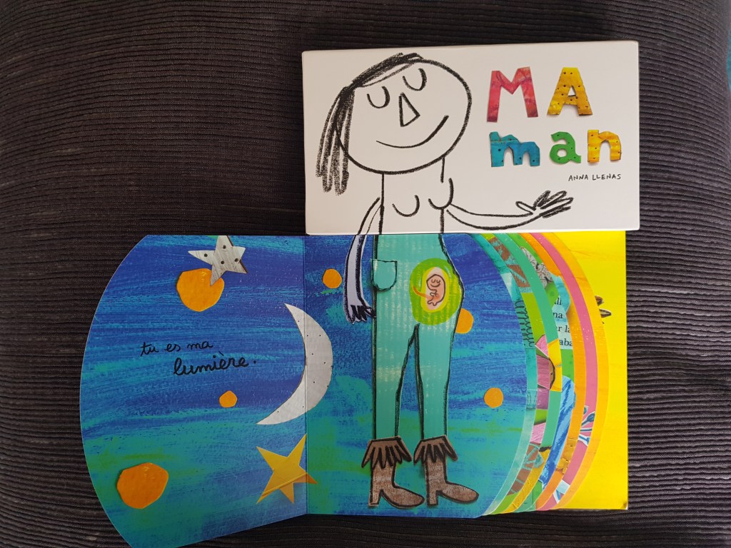 Cet album est un tout carton avec des pages découpées en arrondis de plus en plus grands pour représenter le ventre de la maman qui s’arrondit au fur et a mesure des mois.