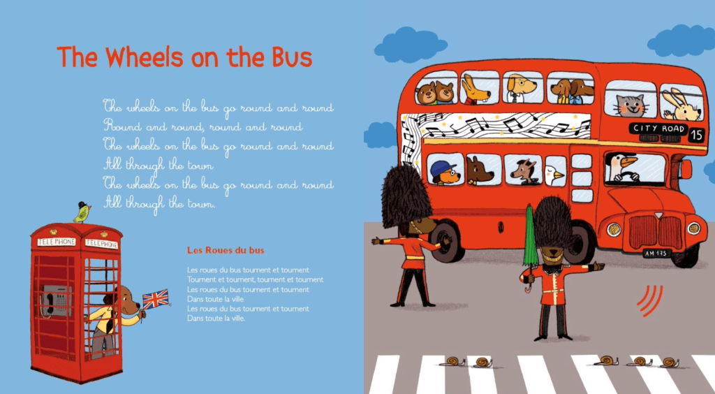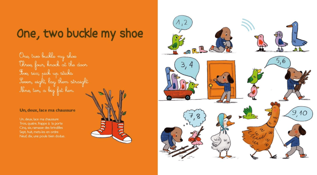 Sur chaque double page, une comptine anglaise illustrée. Les paroles sont bien évidemment écrites en anglais, mais sont également traduites en francais.