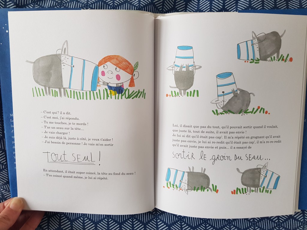 6 courtes histoires donc dans cet album, qui nous fait partager des tranches de vie de Mirabelle, petite fille espiègle et amoureuse de la nature, et de son ami Viandojus, un sanglier mal embouché. Leur rencontre vaut le détour et on a bien ri en la lisant !