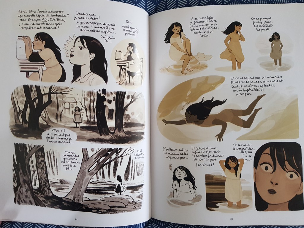 Curieuse, elle s’intéresse aux insectes, aux animaux et à la nature qui l’entoure. Pourquoi les sauterelles jaunes sont elles plus nombreuses que les vertes cet été ? Quand elle s’adresse à son grand-père pour obtenir une réponse, il lui dit d’y réfléchir par elle-même.