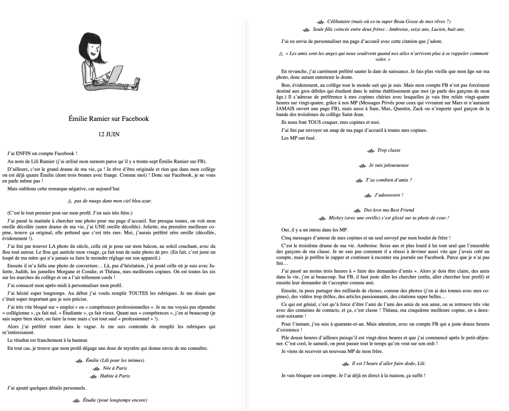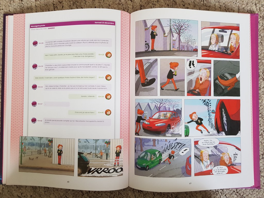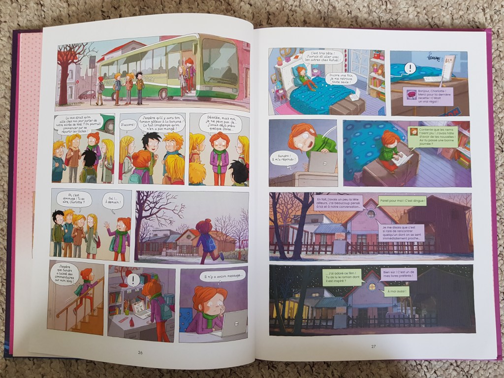 Pages BD classiques se mêlent à des captures d’écran du blog de Charlotte, ce qui rend l’album très vivant et ancré dans la réalité. Et soyons honnête, le format BD est souvent plus attrayant que les romans pour les pré-ados.