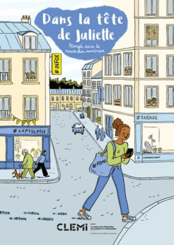 Le Centre pour l’Éducation aux Médias et à l’Information (CLEMI) a crée un support pour les pré-adolescents et adolescents. « Dans la tête de Juliette est une bande dessinée éducative qui nous plonge dans le tourbillon de la vie d’une adolescente connectée. Elle interroge avec finesse et pédagogie le rapport des plus jeunes aux écrans, en particulier avec leur smartphone. L’objectif est de les aider à devenir des acteurs conscients et responsables de leurs usages numériques. »