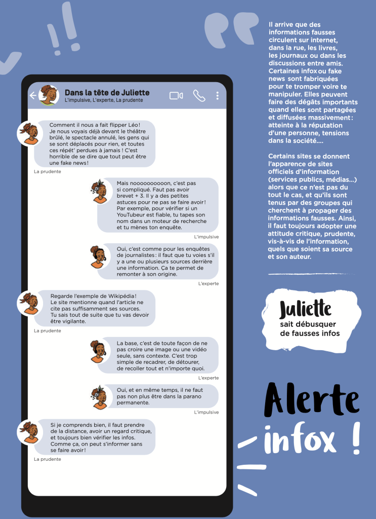 Les conversations des mini-Juliette permettent de se poser des questions et de faire naître des débats ou expliquer des notions comme la surcharge cognitive, les algorithmes de recommandation, la nomophobie, l’évaluation de l’information, l’identité numérique ou le cyberharcèlement.