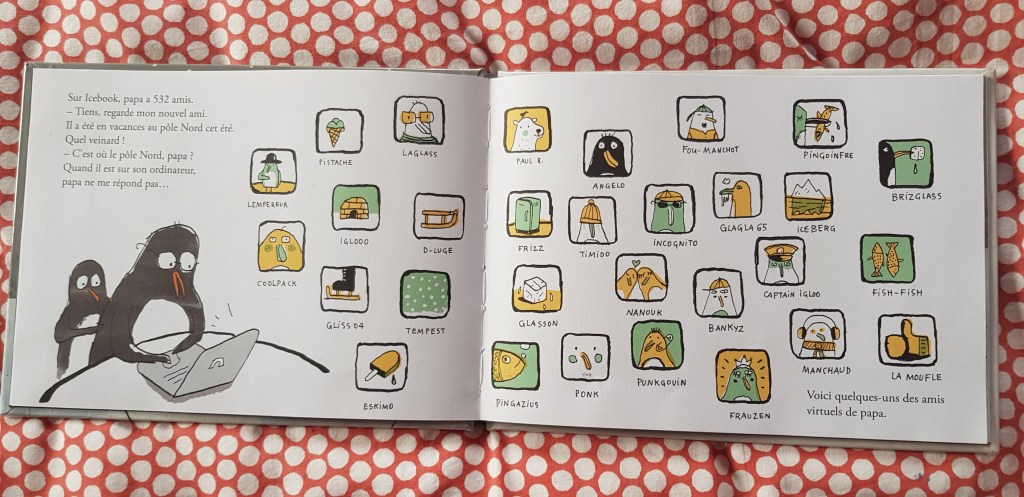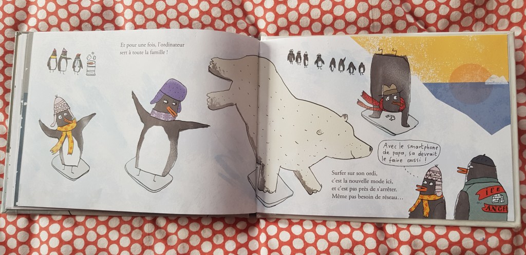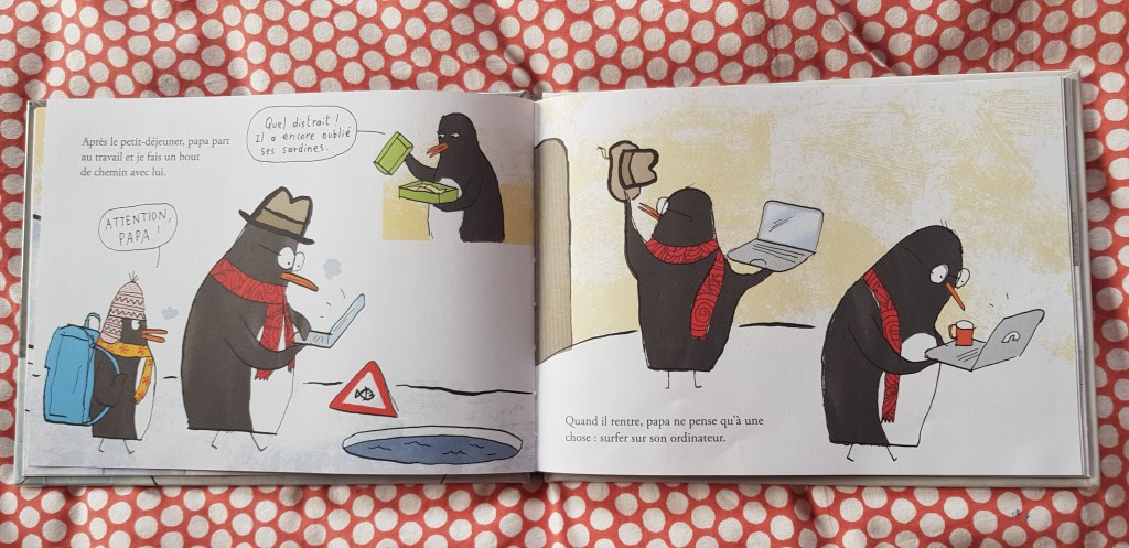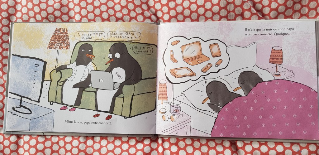 Dans cet album, un petit pingouin se désespère : son père est sur un écran, du matin au soir. Informations, réseaux sociaux (Icebook), météo… sa famille passe au second plan : il n’a jamais le temps de jouer avec son fils, ne répond pas quand on lui parle. Bref, il est là sans être là. Tension entre les parents, manque de communication, solitude… les effets d’un addiction aux écrans se font fortement sentir au sein de cette famille.