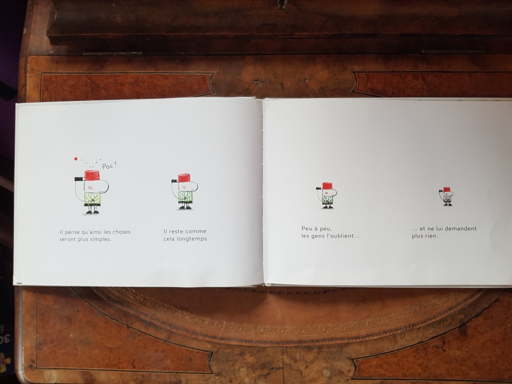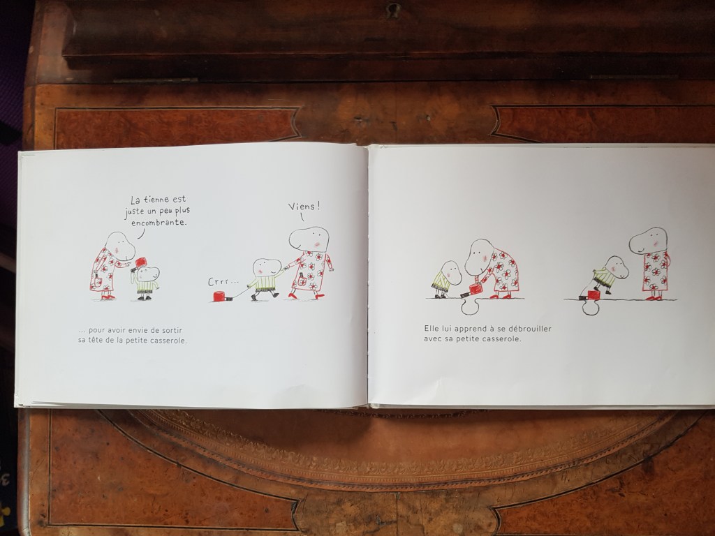 Mais heureusement, une personne extraordinaire croise son chemin. Elle aussi a une petite casserole d’ailleurs. Mais elle est bien rangée, dans une de ses poches. Cette merveilleuse personne va lui apprendre à considérer cette casserole comme une force. Elle va lui montrer toutes ses qualités. Elle va lui apprendre à vivre avec sa casserole. Comment ? En lui fabriquant une petit sacoche pour la ranger, pour qu’elle le gêne moins.