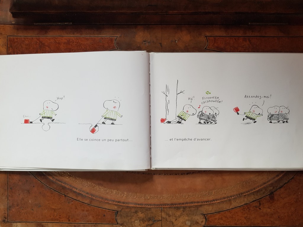 Et grâce à sa sacoche, Anatole se sent bien plus léger et adroit; il arrive maintenant à jouer avec les autres. Il est toujours le même pourtant, et sa casserole est toujours là.
