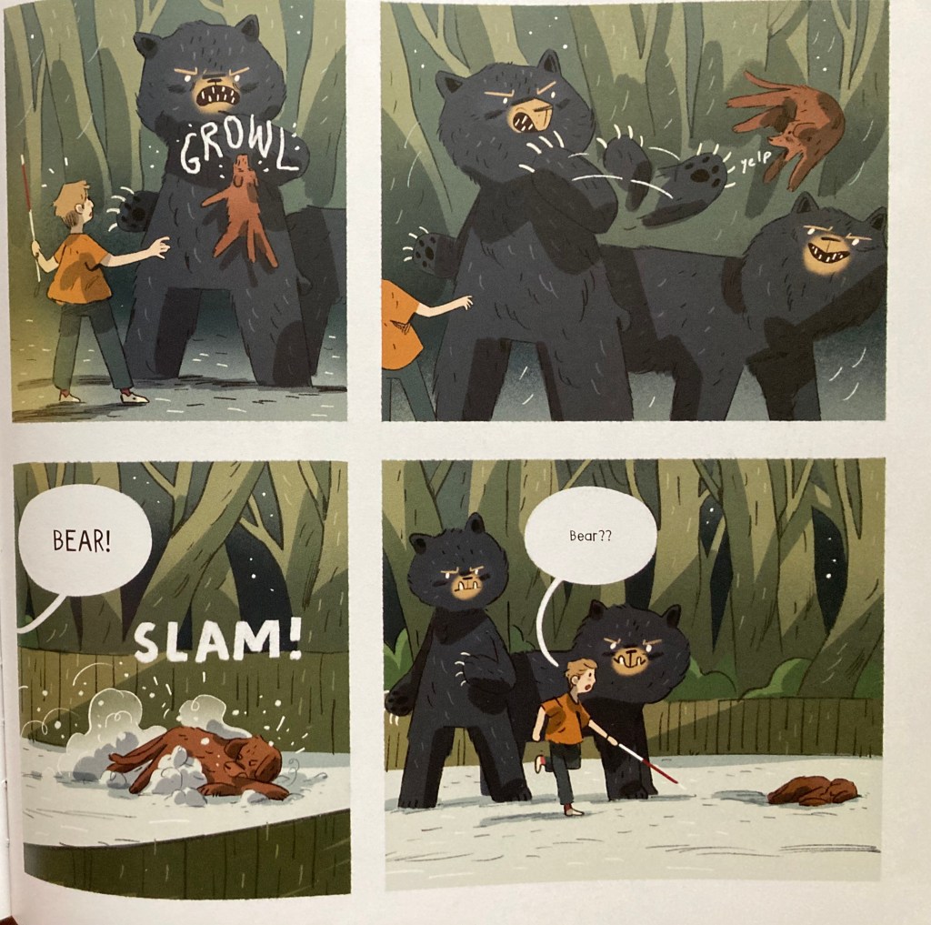 Dans la forĂȘt, il va rencontrer un ours qui s’appelle Stone et qui va l’aider Ă retrouver son chemin vers la ville et son maitre Patrick. A chaque fois, une image de ce qu’imagine Bear et une autre de la rĂ©alitĂ©. Bear imagine par exemple AndromĂšde la chauve-souris comme un oiseau fantastique ou Stone comme une gros chien comme lui.