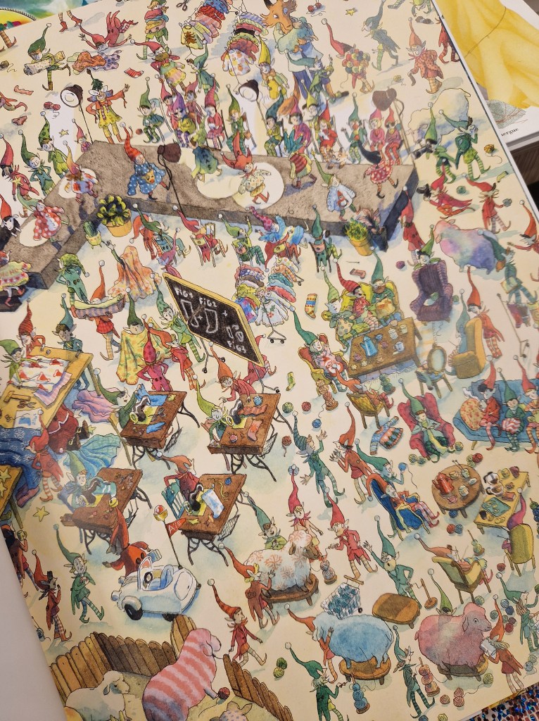 Une fois n’est pas coutume, je commence par parler des illustrations d’Anne Montel, toujours aussi merveilleuses. Les pages pullulent d’illustrations plus poétiques les unes que les autres, et on prendra autant (voire plus) de plaisir que les enfants à farfouiller dans les pages pour trouver le Père-Noël (entre autres). À chaque lecture, on découvrira de nouveaux éléments, qui n’ont parfois rien à voir avec le scmilblick (une Pokeball, le Chatbus de Totoro…)