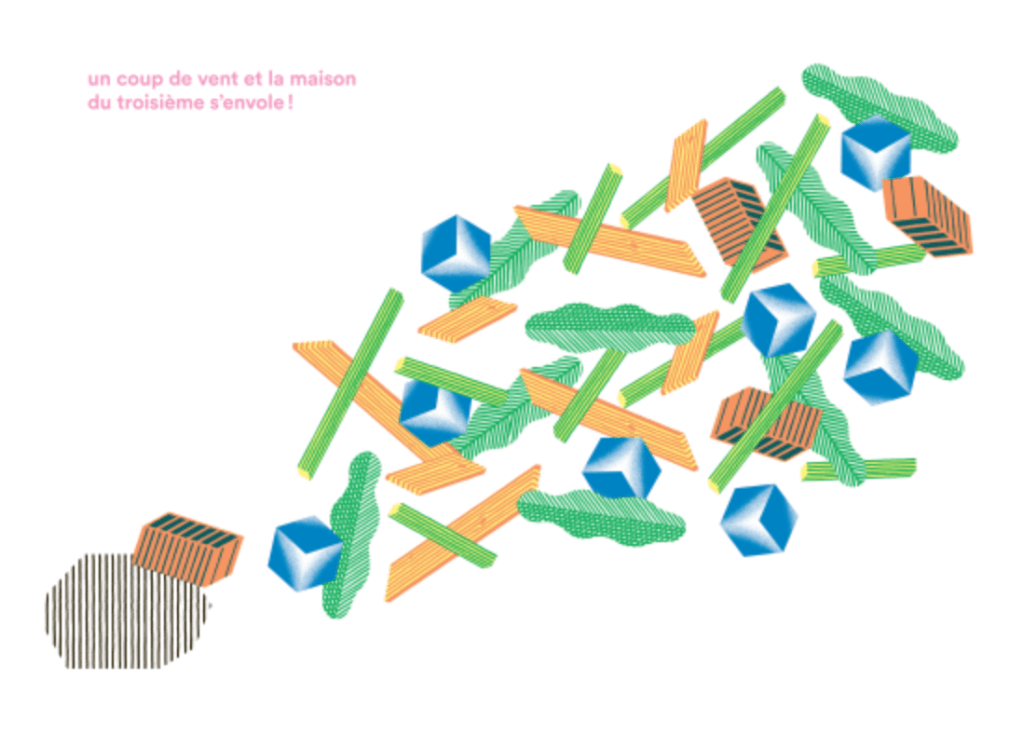 Voilà la version des trois petits cochons d’Aurélien Débat, ou en tous cas le clin d’oeil à ce conte que nous connaissons tous par coeur.