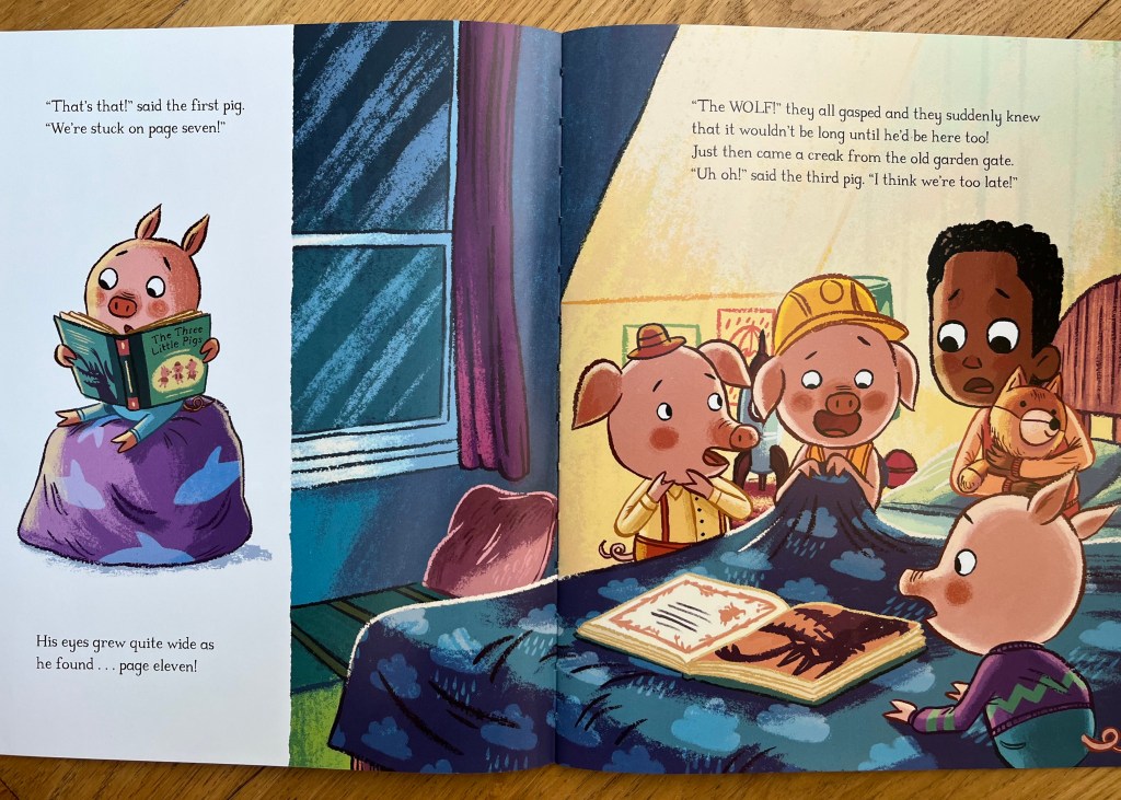 Comme la Maman ne remonte pas immĂ©diatement, Ben s’impatiente et essaie de lire le livre par lui mĂȘme mais la tĂąche n’est pas Ă©vidente, c’est alors qu’un invitĂ© surprise se prĂ©sente. Le premier des cochons de l’histoire, puis le second et enfin le troisiĂšme. Ils essaient d’aider Ben Ă lire la suite mais n’ont pas vraiment l’air plus douĂ©s pour la lecture.