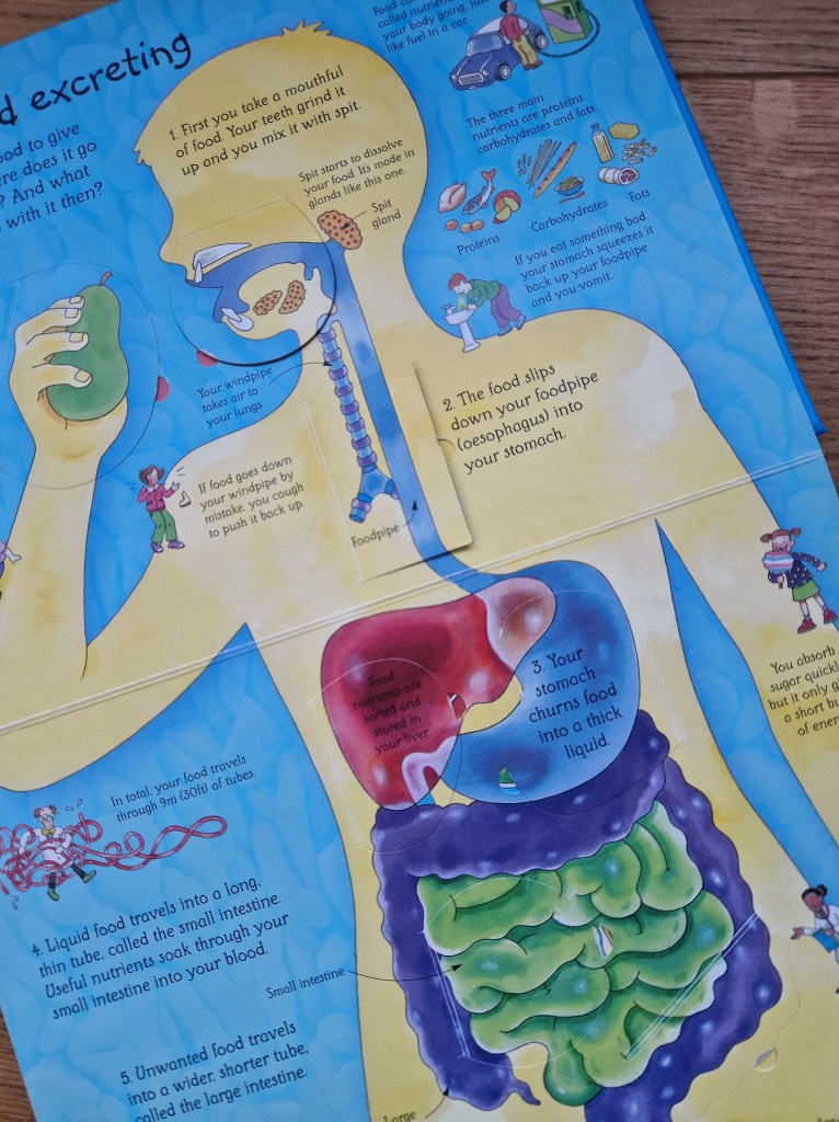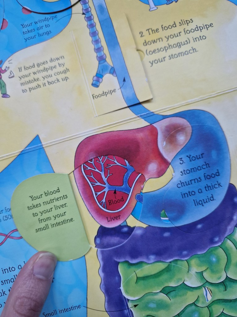 Un album hyper complet, regorgeant de nombreuses petites infos (et de grosses infos importantes bien sûr) que les petits apprendront avec plaisir en soulevant les flaps et en découvrant ce qui se cache derrière les bronchioles par exemple, ou comment le sang circule à travers les artères…
