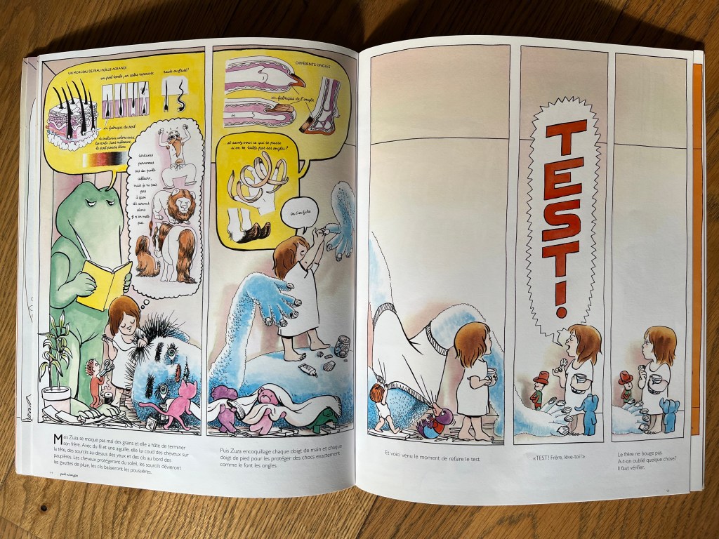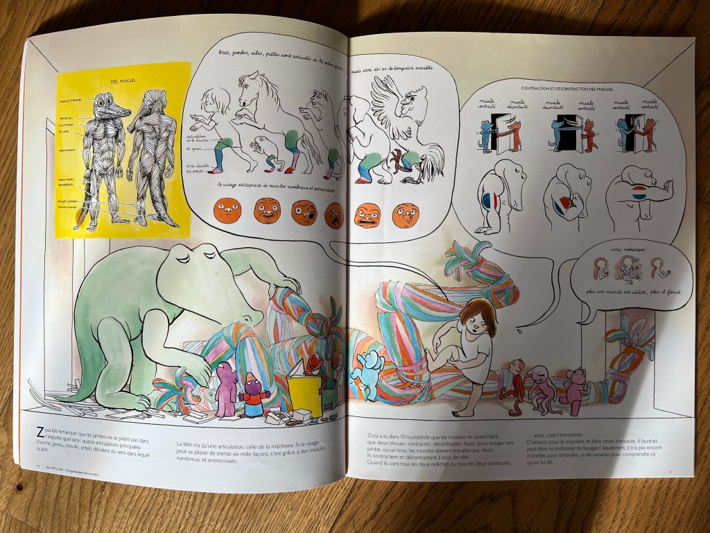 Cet album géant est un mélange de textes, de bulles et de planches anatomiques. C’est à la fois, une histoire, une BD et un documentaire. Mais contrairement au livre d’anatomie, on ne décortique pas le corps, on part de rien et on le construit. Ce livre fourmille de détails, mes enfants ont passé des heures à l’explorer.