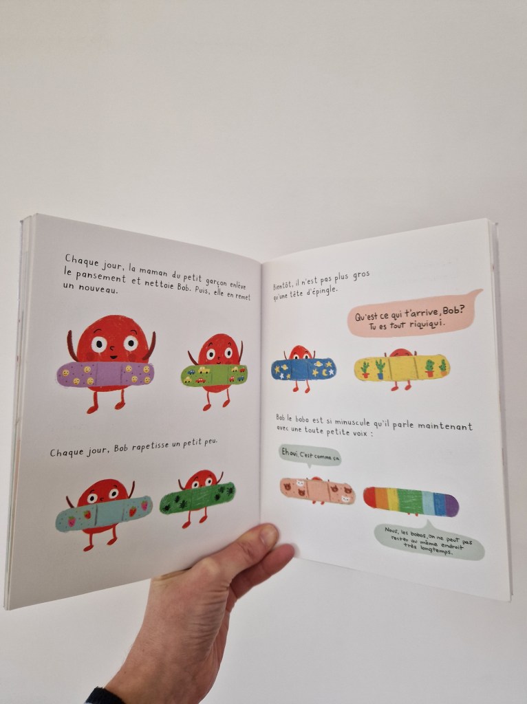 Un super livre qui donne envie d’avoir plein de bobos , et qui m’aurait rendu bien des services lorsque mes enfants étaient petits, vu qu’ils criaient plus pour le pansement qui tire les poils que pour le bobo en lui-même.