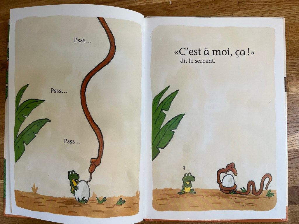 Hop, une grenouille apparait, (ça fait une peu moins peur que le lion) et trouve un bel oeuf blanc, lisse et scintillant; une beau trésor à s’approprier en somme. Mais les amphibiens ne sont pas les seuls à pondre des oeufs.