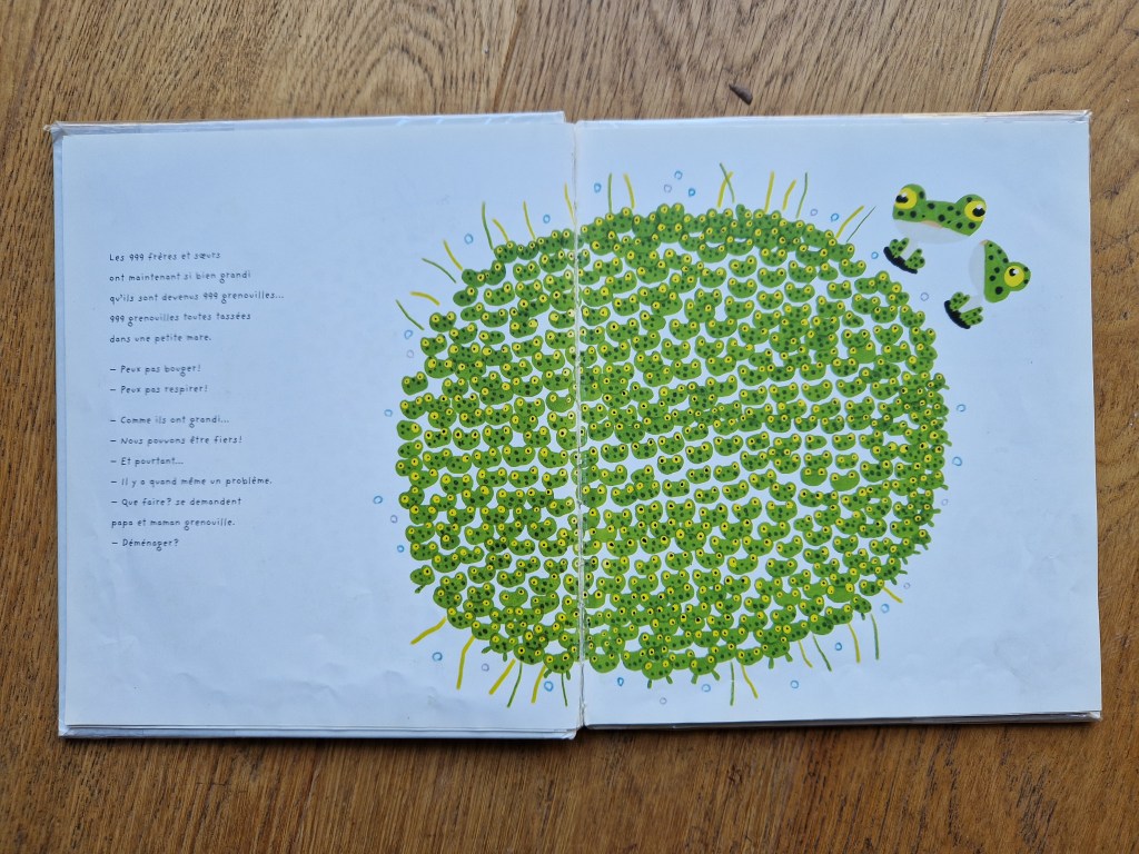 C’est le printemps ! Maman grenouille a pondu 999 œufs. C’est donc rapidement 999 têtards, puis 999 grenouilles qui se partagent cette petite mare ! Celle-ci est vite trop étroite pour tout ce petit monde. Il ne leur reste plus qu’à déménager !