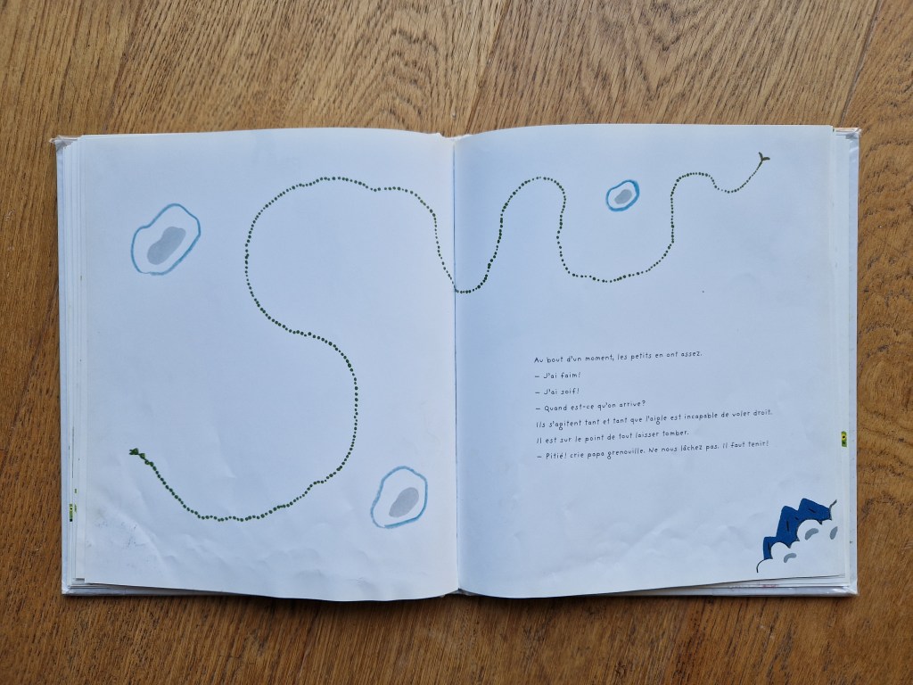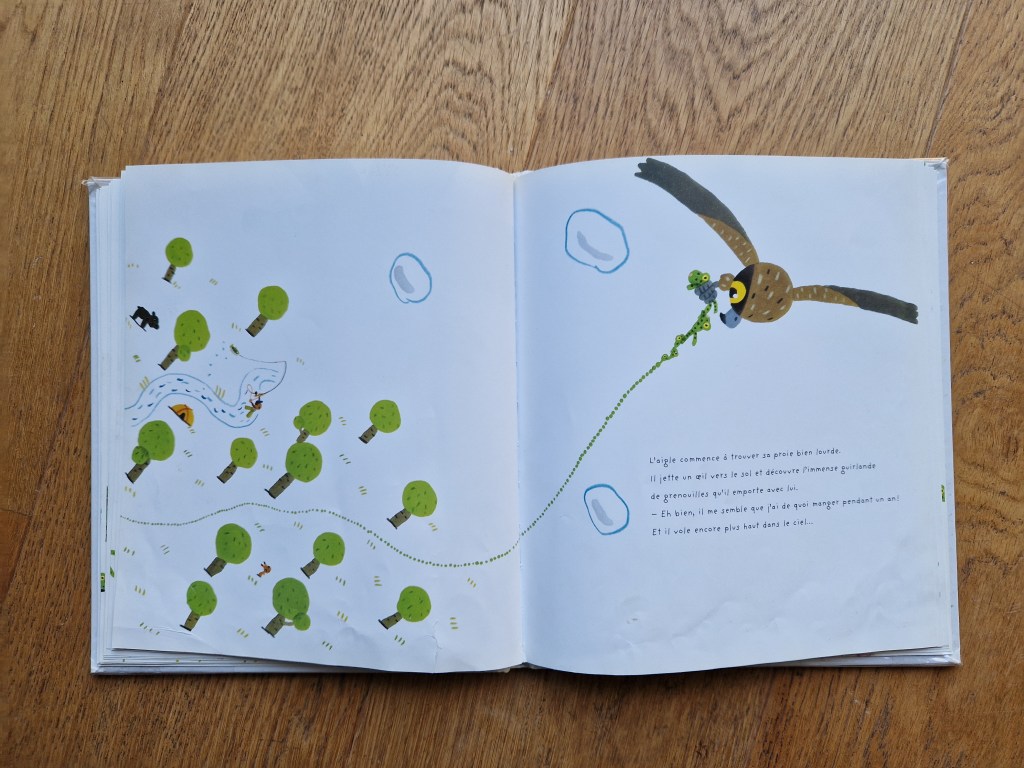 Les 999 grenouilles se mettent donc en file indienne, à la recherche de leur nouvelle maison… Mais leur chemin est semé d’embûches !