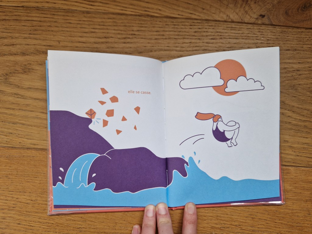 Voici un bien bel album en trichromie (bleu, orange, violet) qui nous raconte l’histoire d’un petit grain de sable. Depuis le rocher qui se détache de la montagne, au chateau de sable construit par les enfants.