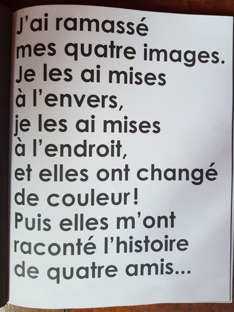On retrouve les 4 images à la fin du livre. À l’enfant de jouer avec son imagination et d’inventer ses propres histoires.