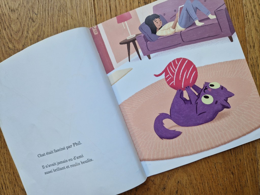 Chat a un nouveau copain. C’est une pelote de laine que sa maitresse a ramenée à la maison. Elle s’appelle Phil.