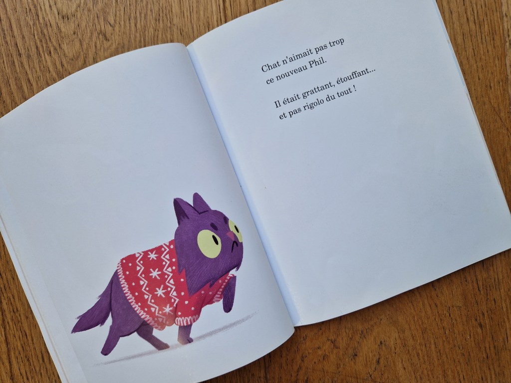Sauf que Phil est là pour une bonne raison : se faire tricoter. Et après quelques jours de travail, Phil la pelote est désormais Phil le pull. Le pull pour Chat. Bien moins drôle… et en plus il est tout plat et il grate.