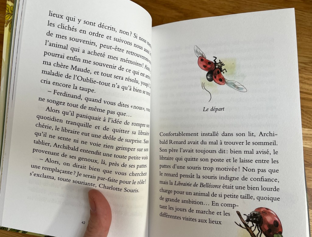 Car notre aventure commence en été. Dans la forêt de Bellécorce, le renard Archibald tient une librairie (quand on aime le Japon, le renard est forcément un animal fétiche!), Ferdinand Taupe avait écrit le récit de ses mémoires et déposé le livre à la librairie, mais un client l’a acheté et personne ne se souvient de qui il s’agissait. Il faut pourtant retrouver ce livre, et avec celui-ci, les souvenirs de ce vieil animal qui s’effacent.
