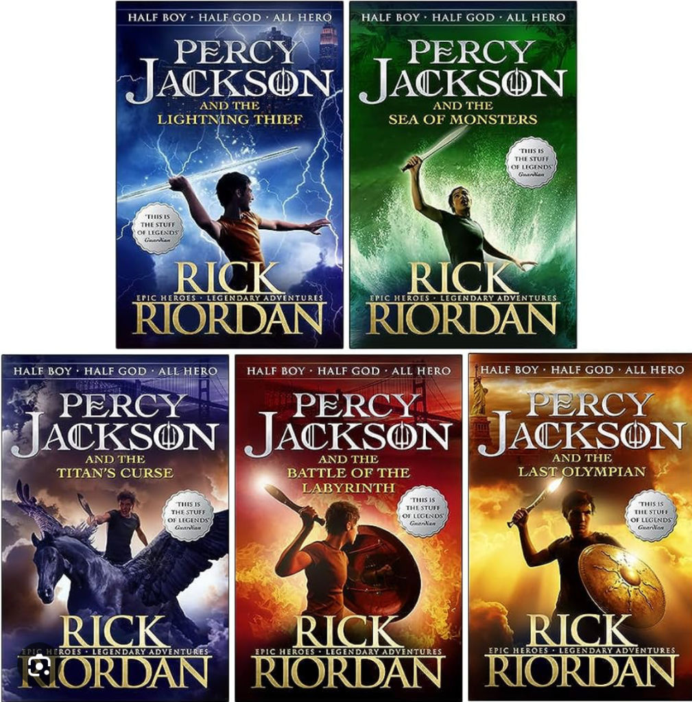 Bien que mon fils adore les sagas, les livres de Rick Riordan sont sans aucun doute ses préférés. Il les a tous lus à plusieurs reprises et prennent une grande partie de sa bibliothèque. Je ne vous parlerai aujourd’hui que de Percy Jackson, car c’est avec cette série qu’il a commencé.