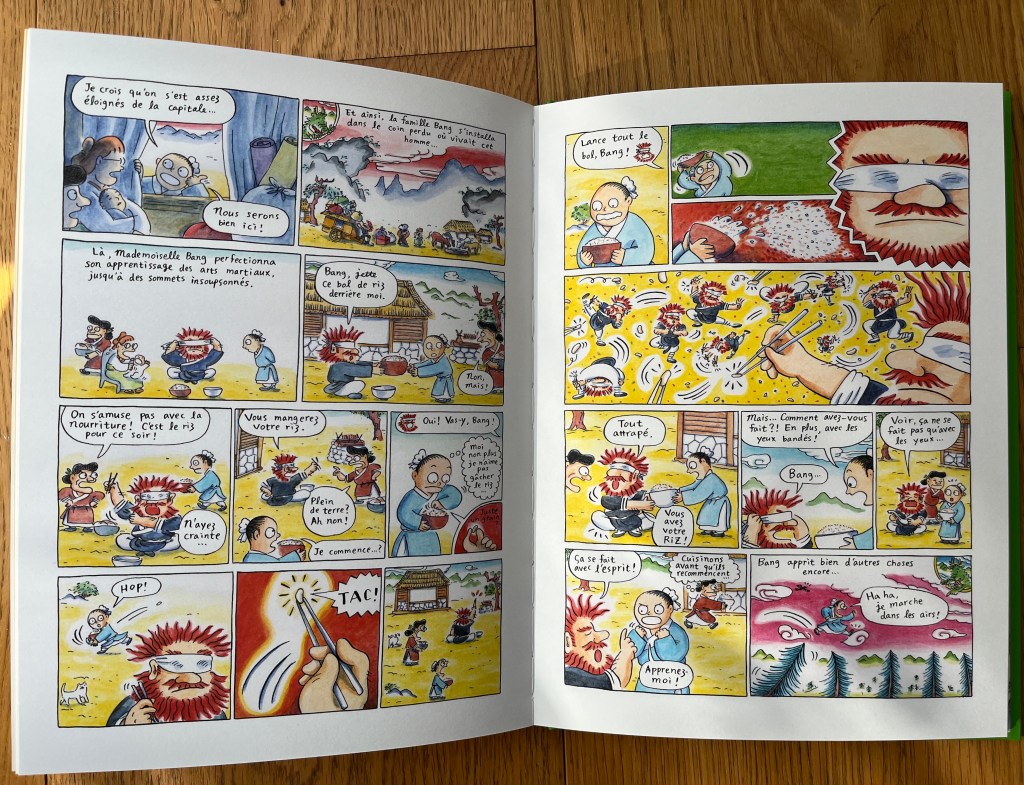 Je trouve le dessin à l’image du livre, très amusant et original; un peu absurde parfois. Des personnages uniques et loufoques; finalement, Mademoiselle Bang malgré l’usurpation de genre semble la plus conventionnelle et sage de tous.