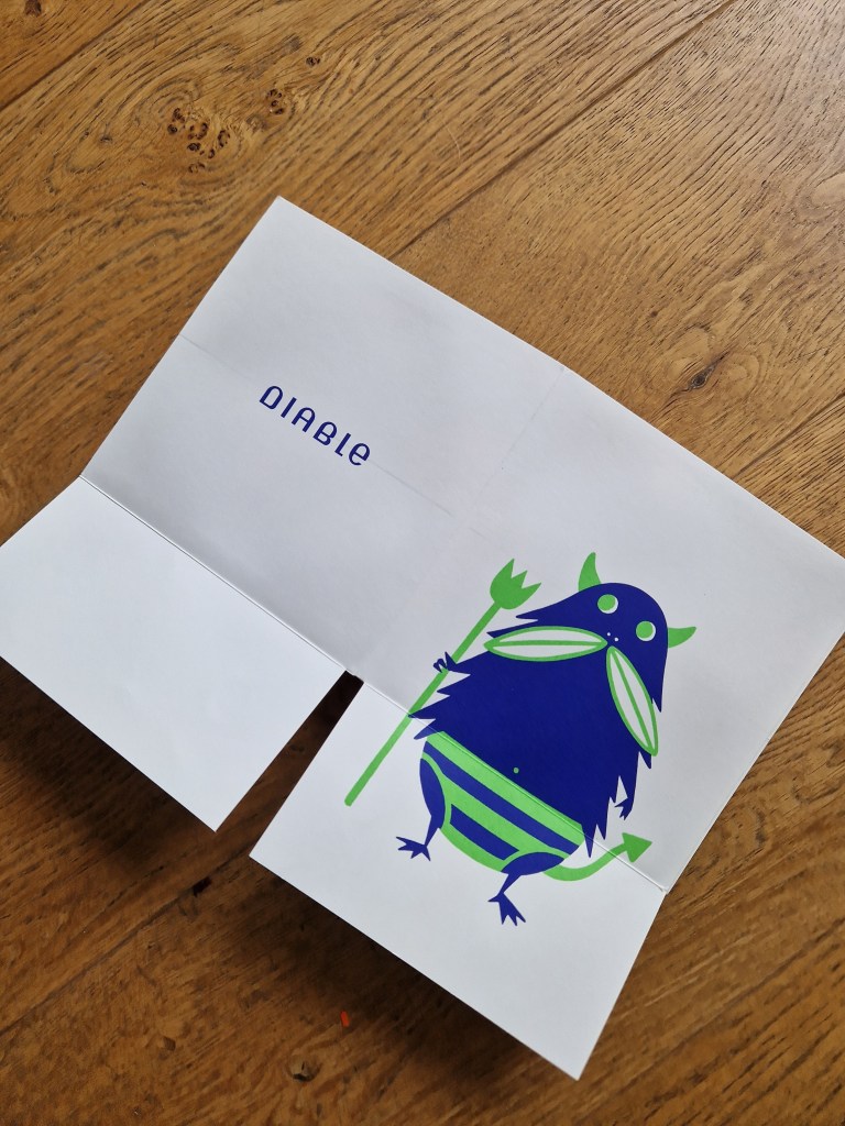 Des animaux en deux tons (bleu et vert), se transforment en créatures extraordinaires, en dépliant un simple volet. De même pour les mots, tantôt coupés horizontalement par le bas ou par le haut. Du génie, qui nous donnerait presque envie de faire la même chose !