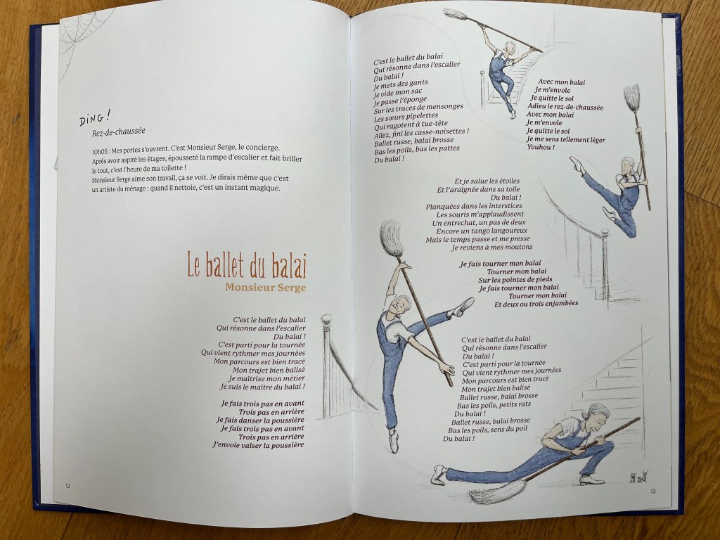 Et oui, comme le titre l’indique, nous partons en musique à la rencontre des habitants qui défilent dans la cabine d’ascenseur d’un immeuble. C’est Eva, la cabine d’ascenseur qui va nous raconter une histoire, celle de ces voisins répartis sur quatre étages. La cabine est un lieu de rencontre et même de création pour le petit Lucien qui égaie le quotidien de la cabine par sa créativité.