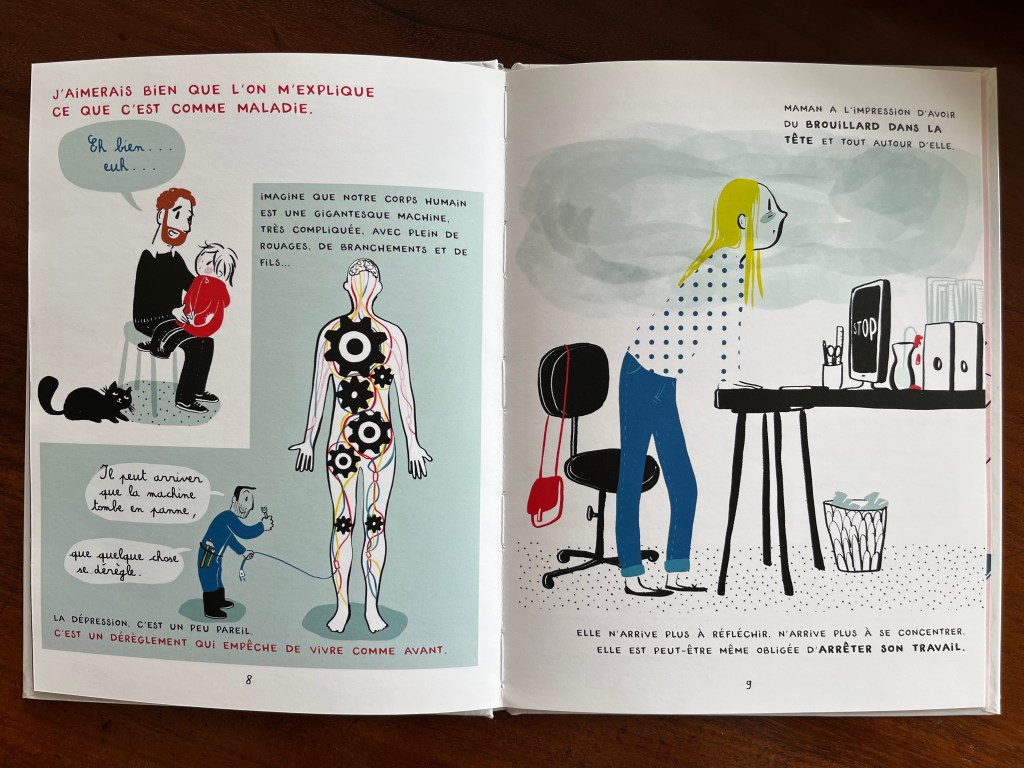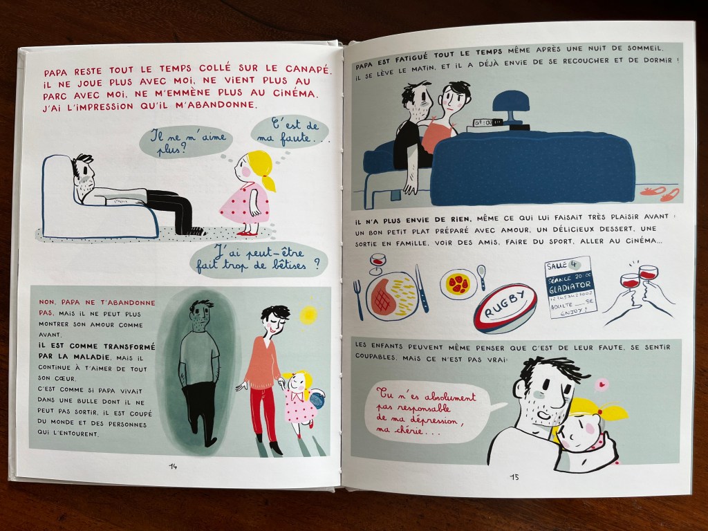 C’est un petit album tout simple qui vise à déculpabiliser les enfants lorsqu’un de ses parents souffre de dépression. On a deux cas, un Papa malade et un Maman malade, chaque enfant peut s’identifier. Les mots sont adaptés, les explications simples mais précises. L’auteure va plus loin que l’explication descriptive de la maladie invisible, elle explique aussi comment avec son amour et sa patience, un enfant pourra accompagner son parent au travers de cette épreuve.