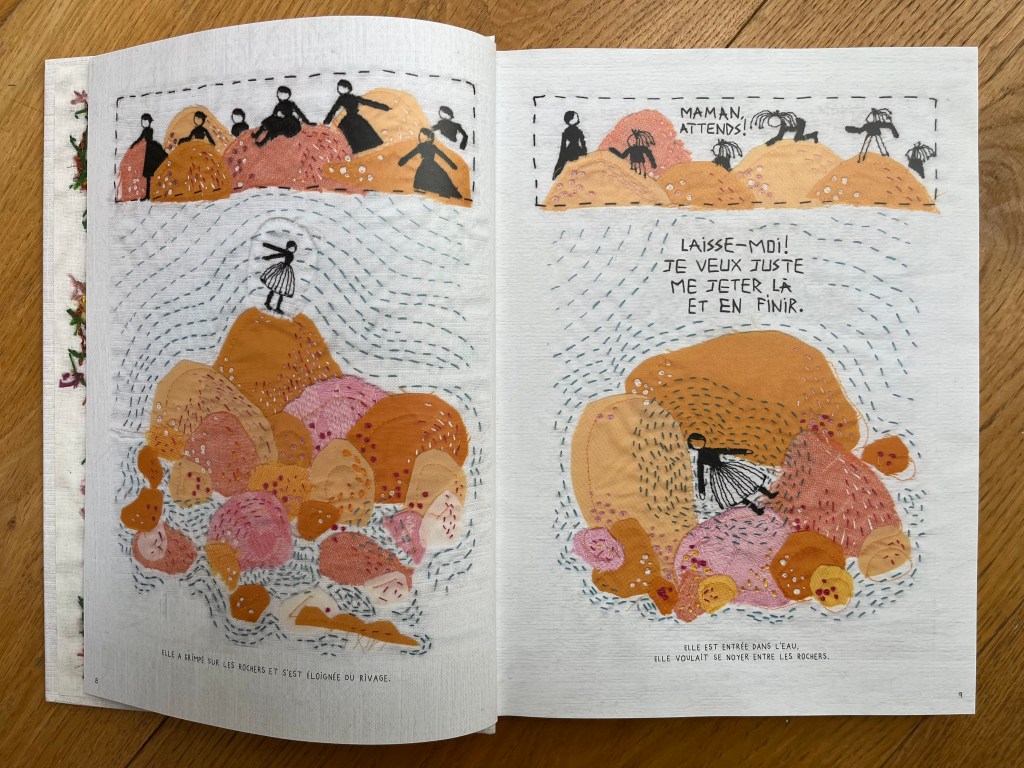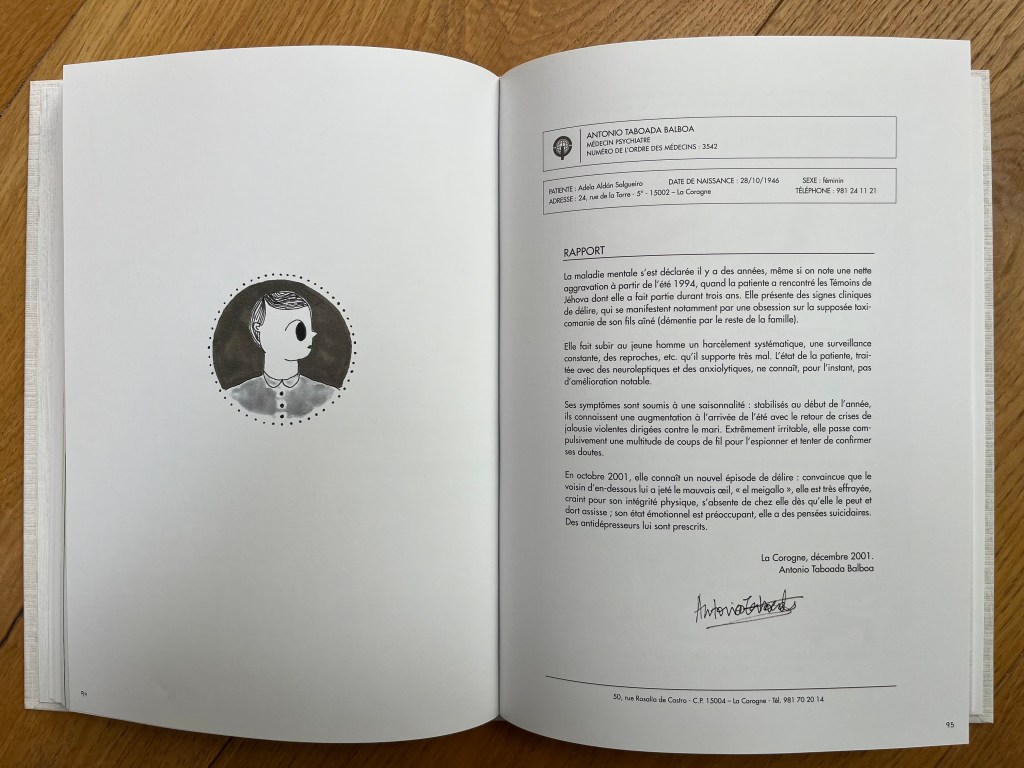 Graphiquement, l’artiste alterne du travail coloré au feutre, avec des rapports médicaux imprimés qui nous confrontent à la pure vérité. Et cette broderie: Adela est couturière, un métier transmis de génération en génération. On a le sentiment que c’est la seule chose qui lui fait plaisir. Bea a choisi la broderie, un savoir-faire qui se transmet de mère en fille. Le temps de reconstruire est-il venu? A-t’elle pu recoudre les morceaux en tissant ce livre? un pansement pour l’avenir.