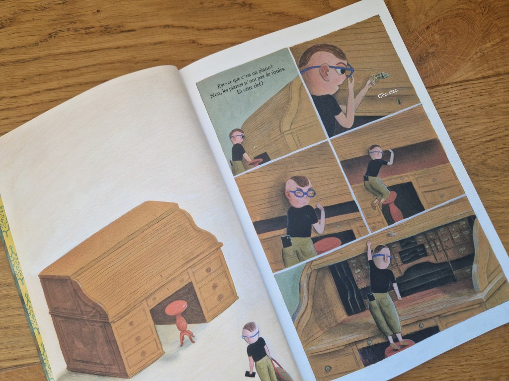 C’est un secrétaire. Plein de tiroirs… vides… mais plein d’odeurs… Et il recèle un carnet caché… Il contient de drôles d’histoires illustrées avec des petits bouts de papiers découpés. Lorenzo s’installe confortablement et commence la lecture…
