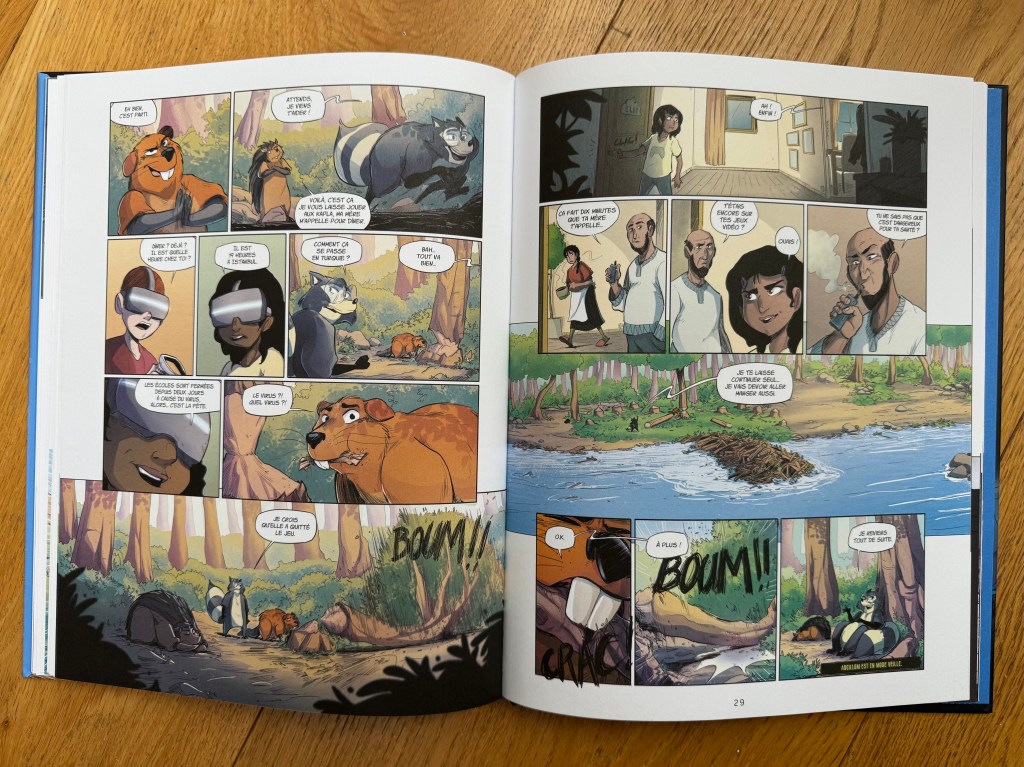 La lecture n’est pas trop dense; ce qui fait que cette BD est accessible dès un jeune âge, l’éditeur parle de 10 ans mais je pense que même un peu plus tôt ça fonctionnera si votre enfant aime les jeux vidéos et que vous n’êtes pas trop à cheval sur les gros mots.