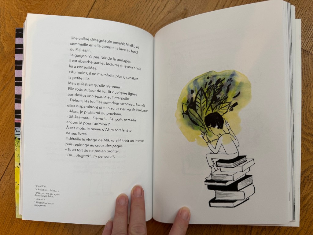 Ce que j’ai trouvé tout particulièrement intéressant dans celui-ci, d’avoir inséré dans les dialogues, quelques début de phrases en japonais, il s’agit pour la majeur partie du temps d’un mot mais ça nous permet d’être au plus près d’une immersion culturelle.