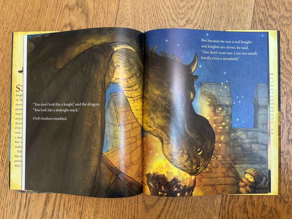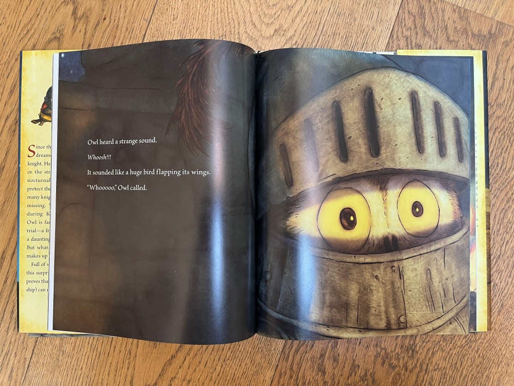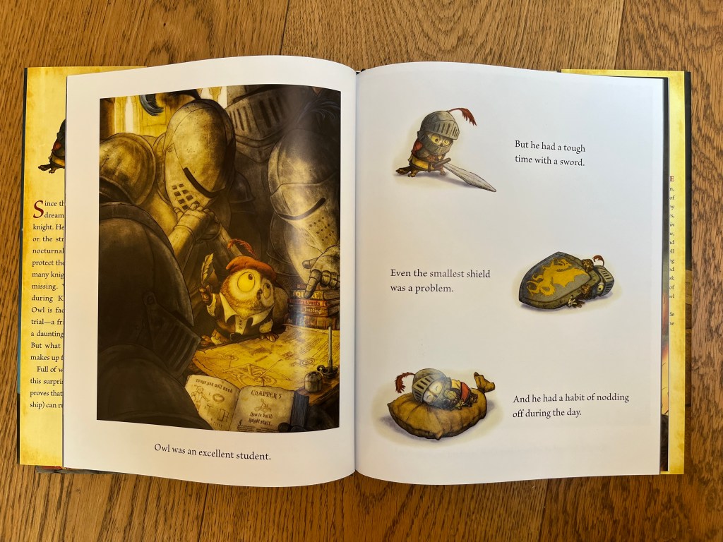 Et cette toute petite chouette va se donner les moyens, elle veut devenir chevalier. On ne peut pas dire que physiquement, il a toutes les qualitĂ©s nĂ©cessaires. Graphiquement, on voir immĂ©diatement la problĂ©matique; la chouette, aux pieds des chevaliers, Ă  l’air microscopique…et cela ne semble ĂȘtre qu’un beau rĂȘve.