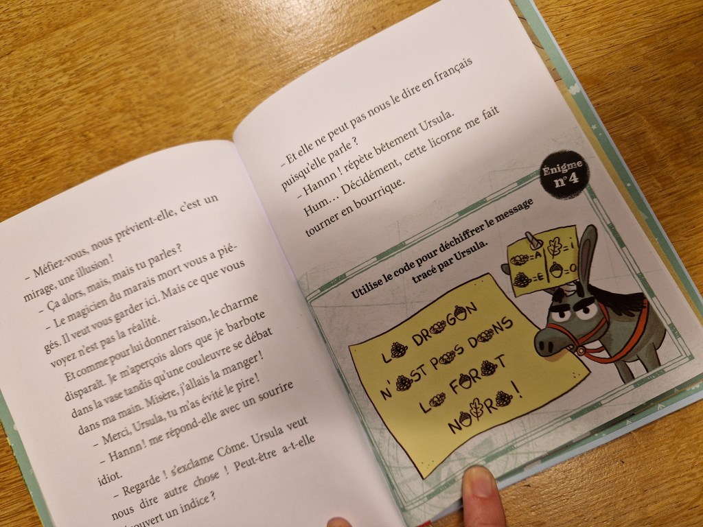 Le roi a disparu. La princesse et son frère chevalier partent à sa recherche, accompagnés de leur fidèle destrier : une licorne loufoque. Le petit lecteur doit résoudre au fil du livre 9 énigmes en tout genre (les mêmes que les personnages). Labyrinthe, texte miroir, intrus, code à déchiffrer, énigme, jeux de lettres, rébus. Autant d’indices à trouver pour avancer sur la carte présente en fin d’album et trouver l’emplacement de la caverne du dragon responsable de l’enlèvement du roi. Le tout en 6 courts chapitres, pour pouvoir faire des pauses régulièrement.