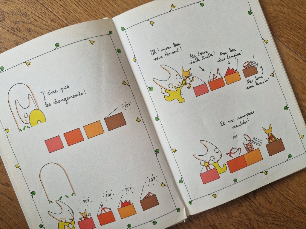 On découvre un lapin grognon qui, comme beaucoup d’enfants, n’aime pas les changements.