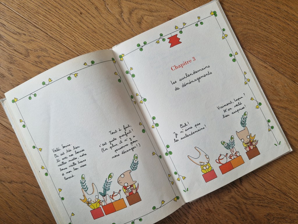 Un album hyper dépouillé et très amusant en trois chapitres, qui parle des affres de faire les cartons, certes, mais surtout des joies de défaire ses cartons, de retrouver ses jouets et de les ranger dans sa nouvelle chambre (Chapitre 1), de se faire de nouveaux amis (Chapitre 2), de retrouver ses anciens amis dans son nouveau chez soi (Chapitre 3).
