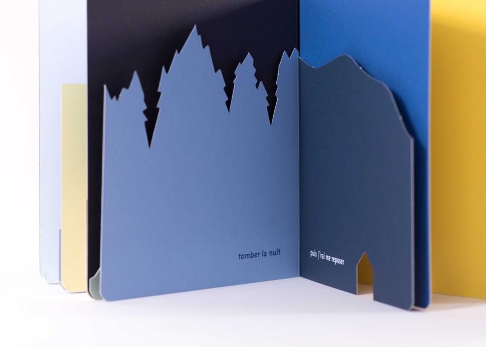 De grands aplats de couleurs, des découpes dans les pages, ce livre splendide nous emmène en voyage en nous montrant une succession de paysages très stylisés.