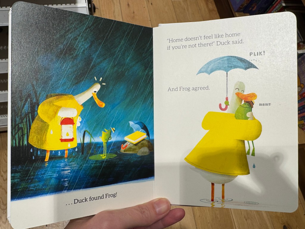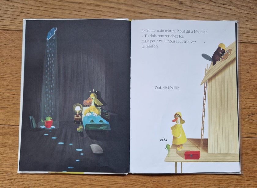 C’est alors qu’il n’a pas d’autre choix que de sortir de chez lui que Plouf fait une rencontre inopinĂ©e. Il propose Ă Nouille de venir s’abriter chez lui.