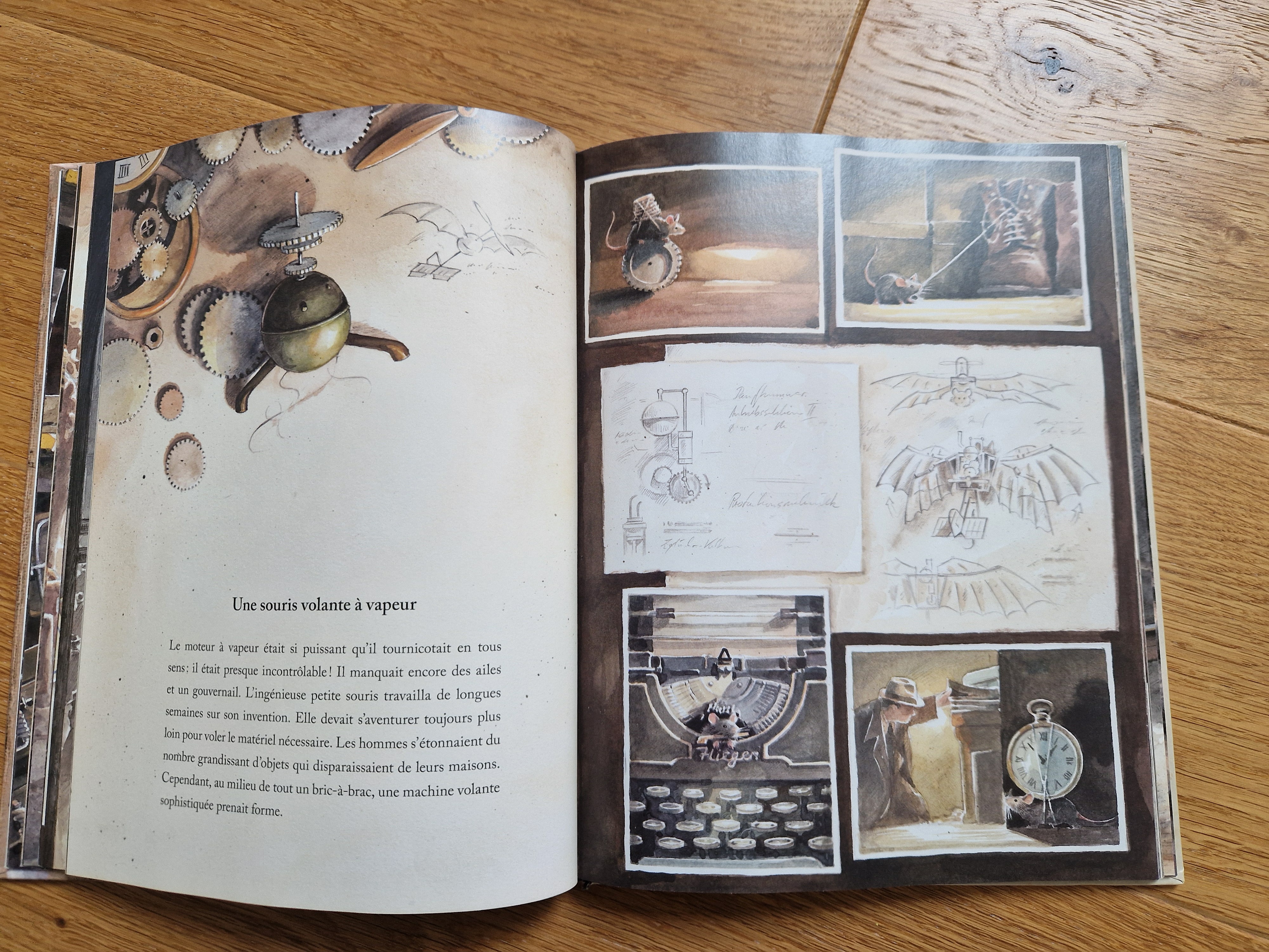 Les illustrations aux tons sépia créent une atmosphère un peu éthérée. Chaque page est un tableau fourmillant de détails techniques, d’engrenages, de plans, d’articles de journaux, de textures de papier vieilli, pour un récit très réaliste.