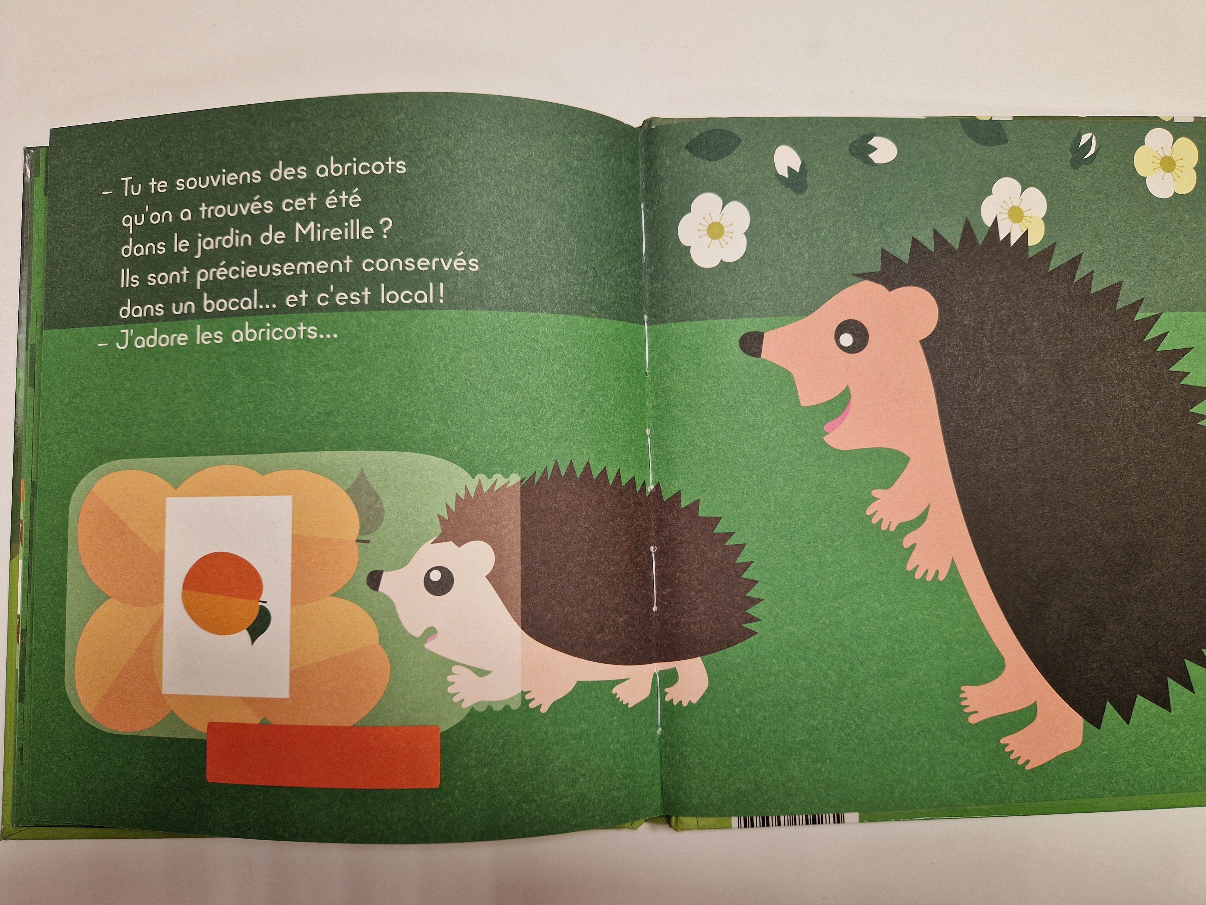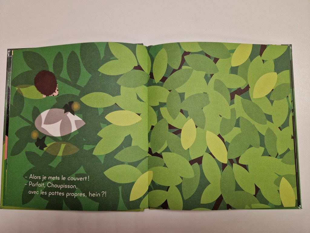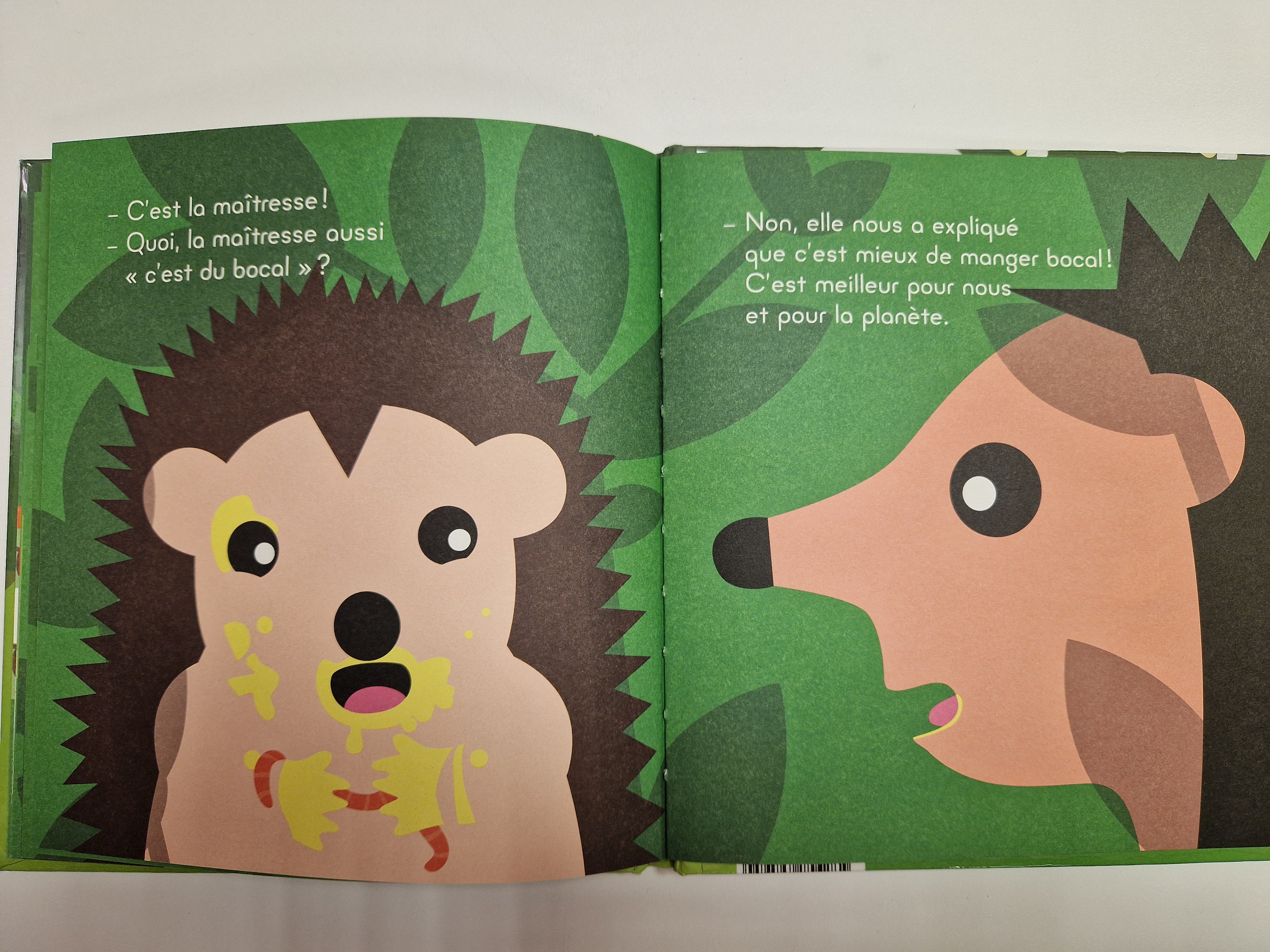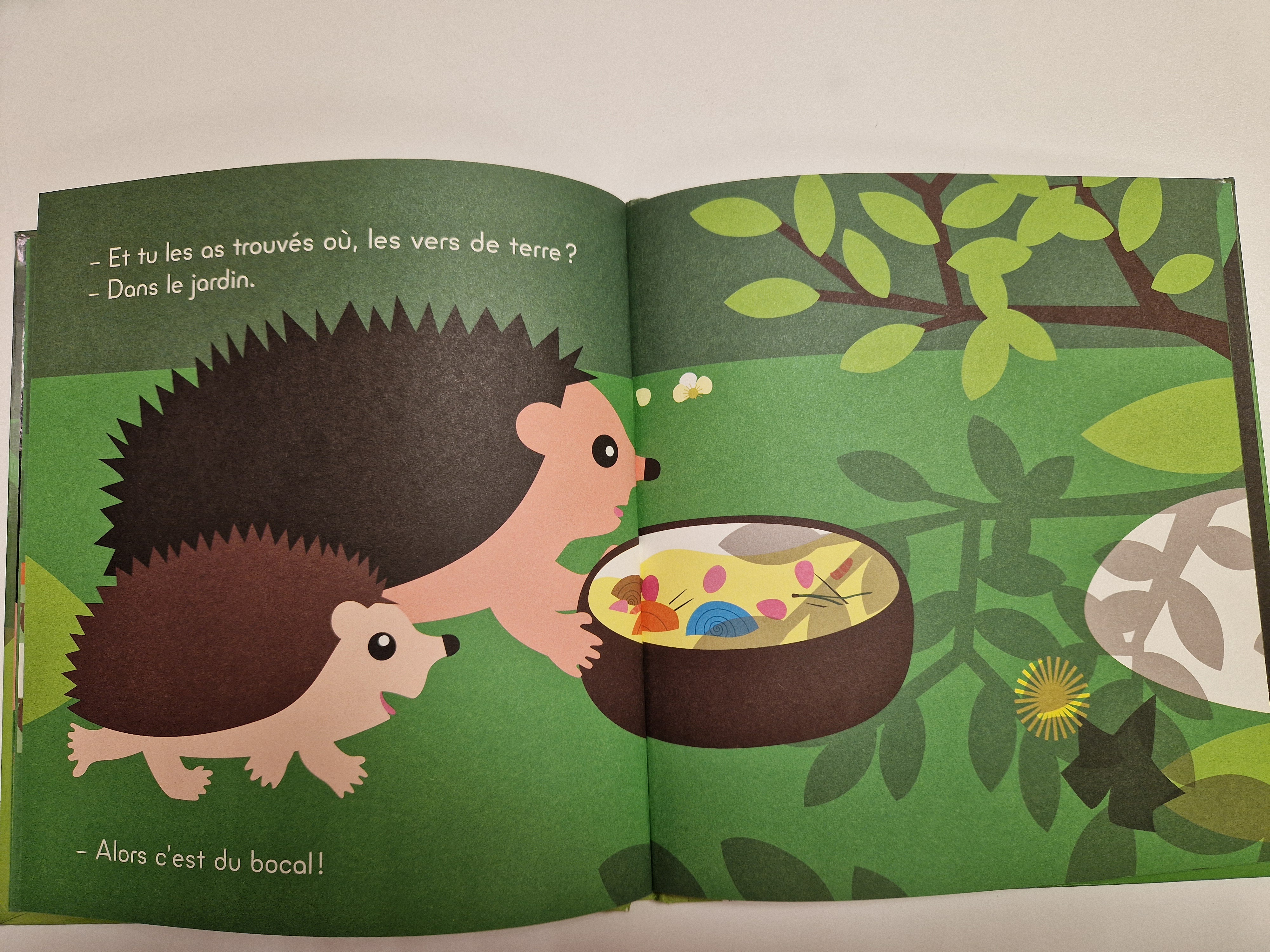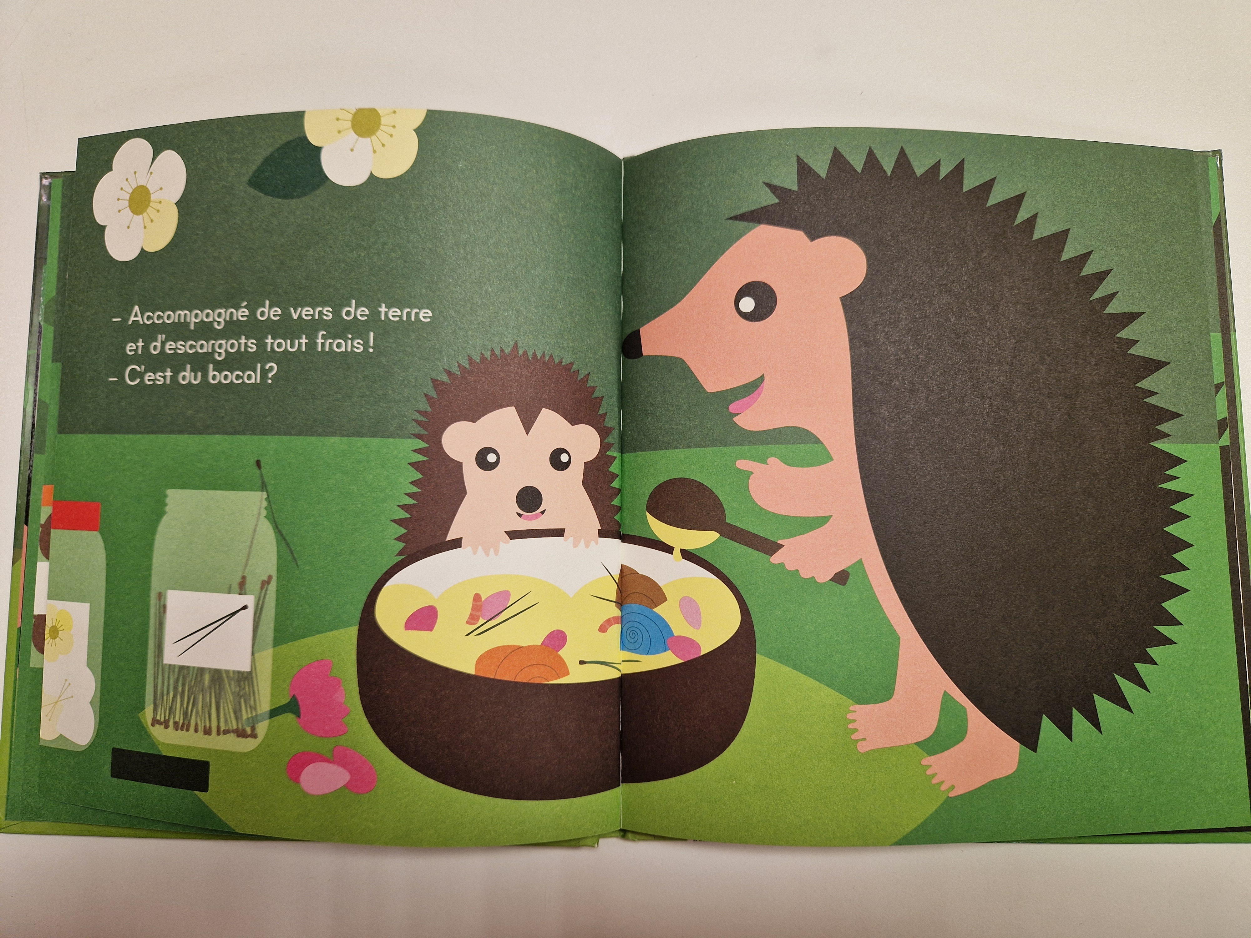 Au jardin, l’heure du déjeuner approche. Papa Hérisson s’active aux fourneaux (rien que ça, ça fait du bien !) tandis que son petit choupisson met consciencieusement le couvert, avec ses pattes propres, bien sûr. Le repas sent divinement bon, mais une question taraude le petit : ce que Papa a préparé, est-ce que c’est bien « bocal » ?