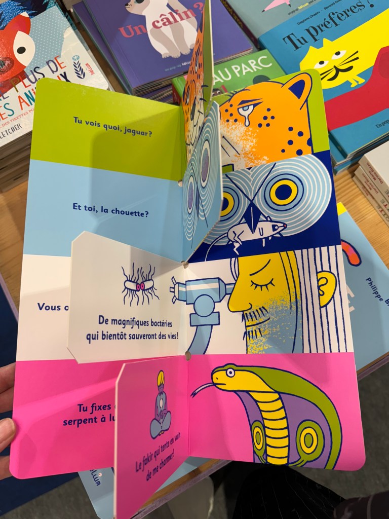 Les plus petits aimeront ce format original qui se lit dans la hauteur, vous pourrez les interroger sur ce que chaque être vaoit avant de lui dévoiler le choix fait par l’auteur. C’est tout à fait le genre d’album qui aurait bien amusé ma fille lorsqu’elle était petite. Il me rappelle d’ailleurs l’un de ses préféré dans lequel il fallait deviner quel animaux se cachait sous une feuille ou derrière une colline. En général, les petits adorent se faire questionner et vous pourrez constater qu’ils sont bourrés d’imagination ce qui prête souvent à des grands éclats de rires!